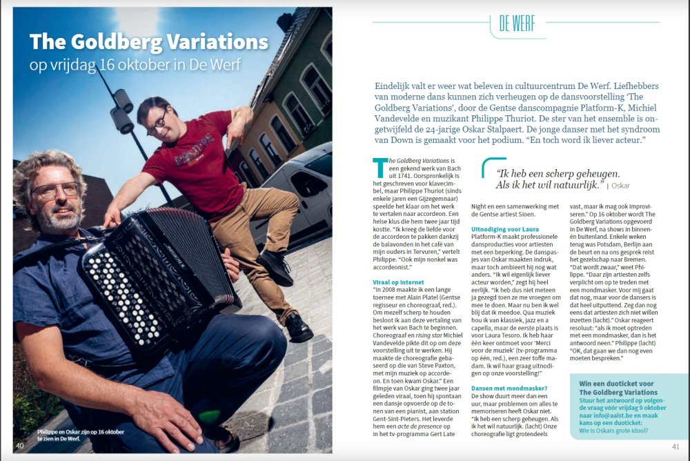 Door een samenloop van omstandigheden. Ik had The Goldberg Variations al in mijn vingers voor een wereldtournee met een ander dansgezelschap. Bach schreef een van de moeilijkste werken om te spelen. De partituur is oorspronkelijk voor clavecimbel bedoeld en ik heb die omgezet voor accordeon. Je ziet, ik hou van een uitdaging. (lacht) Tijdens de academische opening van de VUB was mij gevraagd om Michiel Vandevelde te begeleiden die dansimprovisaties op The Goldberg Variations deed. Achteraf raakten we aan de praat in de loge en maakten we plannen om hier verder mee te gaan. Nu, samenwerken met dansers is altijd interessant. Ze verplichten je om anders naar de muziek te kijken. Je voelt dat ook aan de reacties van het publiek. Ook thuis ontsnap ik er niet aan: mijn twee kinderen zijn professionele dansers (lacht).